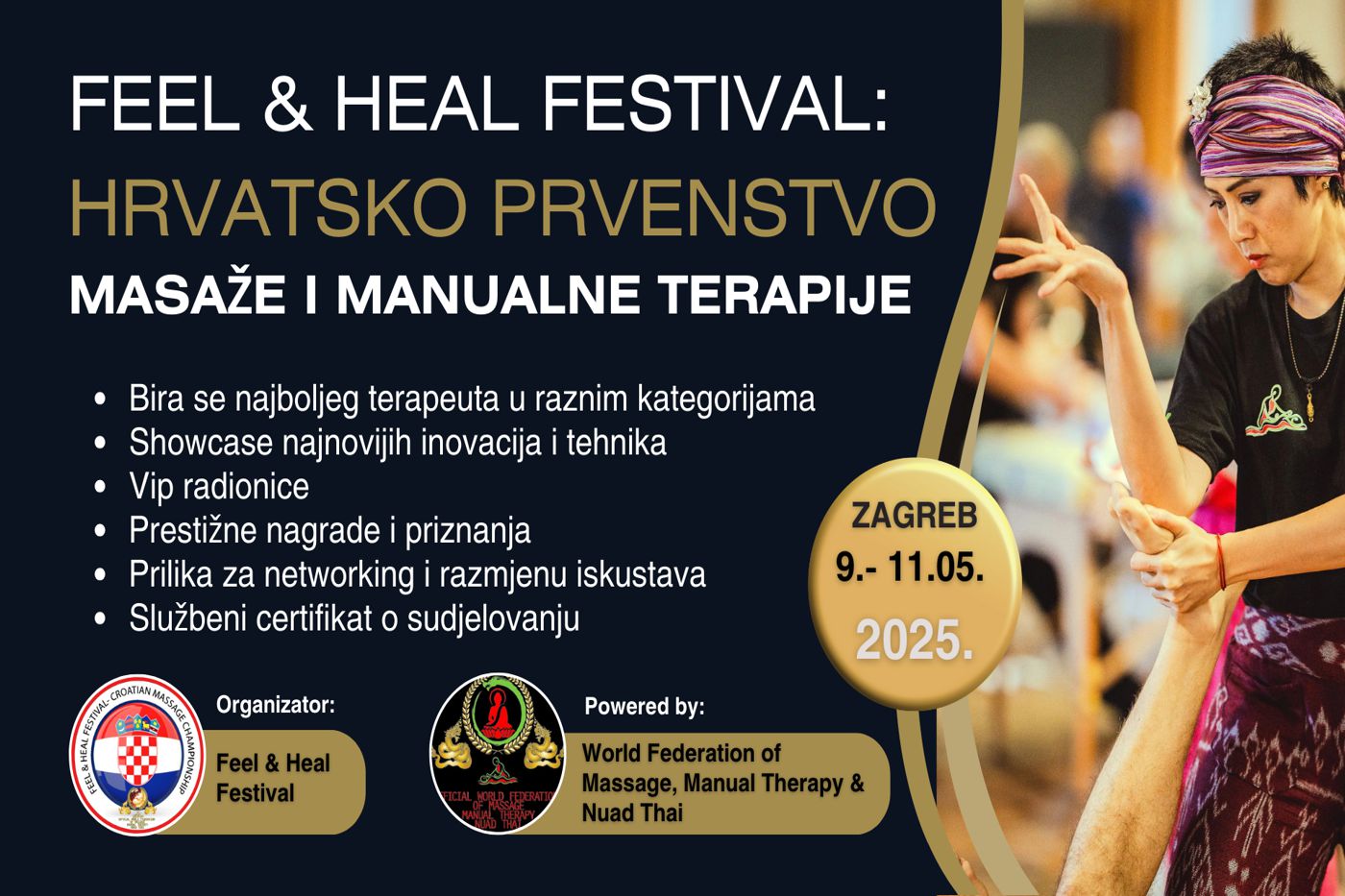 S velikim uzbuđenjem vas pozivamo na prvo izdanje Feel & Heal Festivala – Službenog hrvatskog prvenstva u masaži i manualnoj terapiji 🎉, koje će se održati od 9. do 11. svibnja 2025. u Zagrebu!